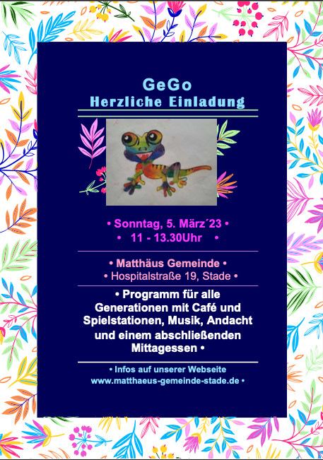 Unser nächster GeGo findet am Sonntag, den 05.03. von 11:00 – 13:30 Uhr statt. Herzliche Einladung!